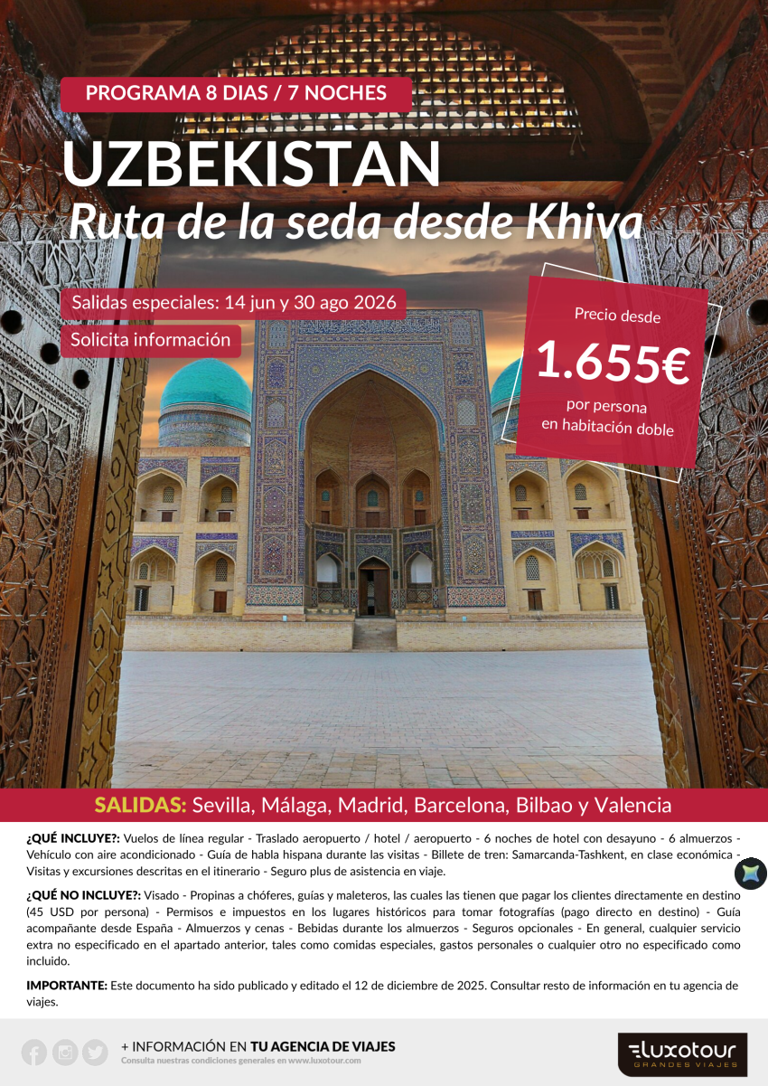 Uzbekistán y la Ruta de la Seda, desde Khiva - Salidas Especiales 14 Junio y 30 Agosto desde 1.655€